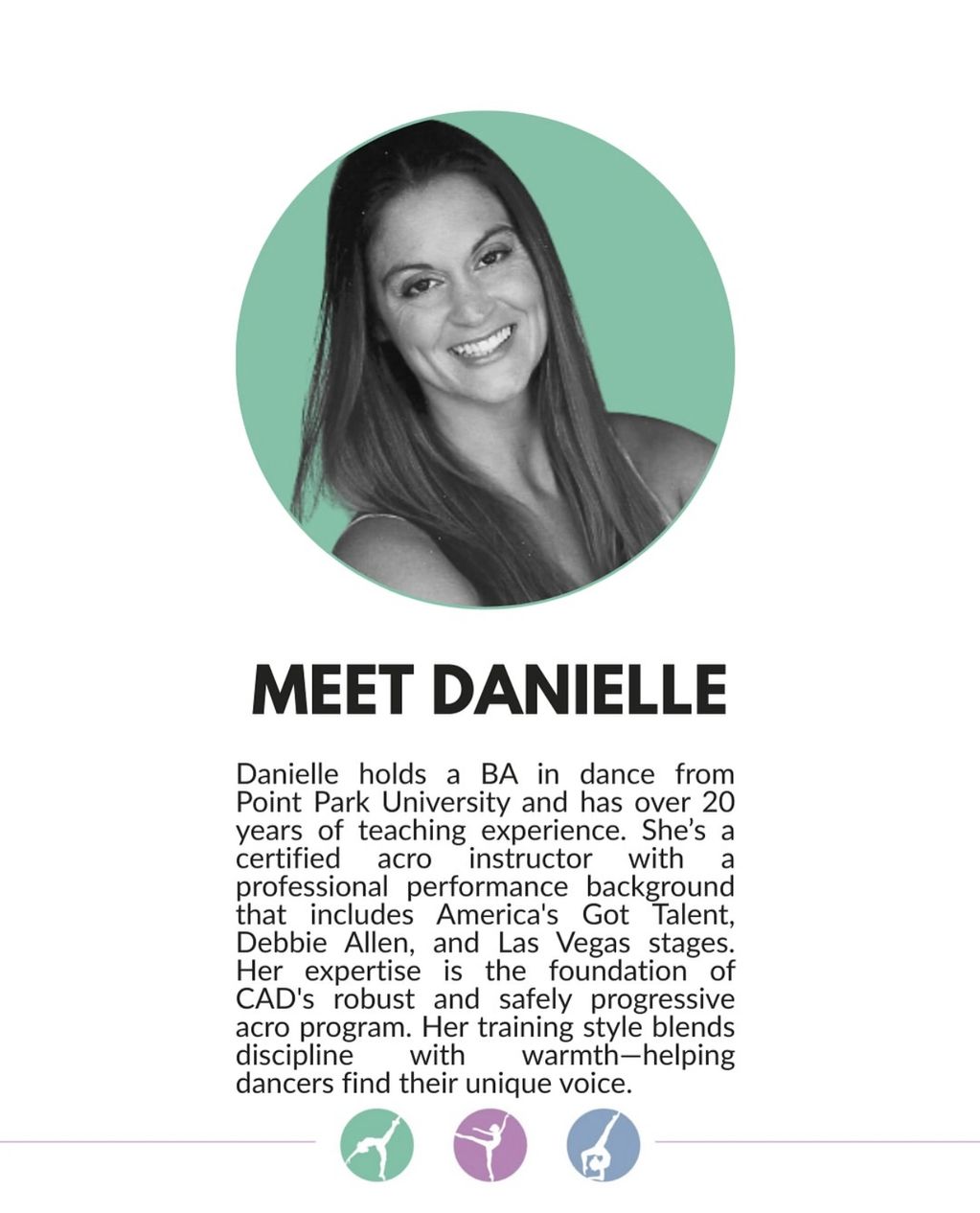 Danielle Marie Roe started dancing at the age of five at Encore Dance Center in Lancaster, PA. She graduated from Point Park University in Pittsburgh, PA with a BA in dance, concentrating in jazz and ballet. Her most influential teachers include Nicolas Petrov (a founder of Pittsburgh Ballet Theater), Marion Petrov, Marjorie Dougherty, and Broadway performer Ron Tassone. She has extensive training